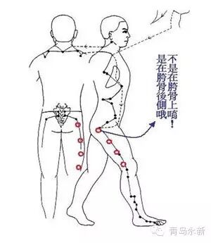 胆经在下肢的巡行路线是沿股、下肢外侧中线下行至小趾、次趾之间。有个很容易找到的标志,就是沿着裤子中间的那条线至膝盖侧面处,主要是环跳、风市、中渎、膝阳关四个穴位。
