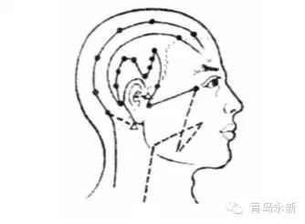 起于眼外角(瞳子 ),向上达额角部,下行至耳后(风池穴)