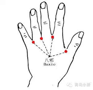 在手指背侧,微握拳,第一~五指间,指蹼缘后方赤白肉际处,左右共8个穴位